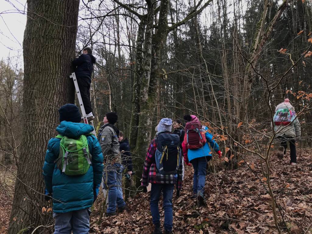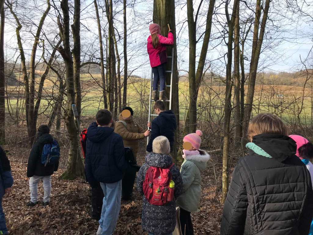 So besuchten im Rahmen des Projekts die beiden vierten Klassen (Schuljahr 24/25) der Grundschule Hammerbachtal an jeweils einem Tag die Mittelschule, um mit den Acht-Klässler*innen aus der Technikgruppe Nistkästen zu bauen. Die Bausätze dafür hatten die Acht-Klässler*innen bereits im Vorfeld vorbereitet. In einer gemeinsamen Aktion hängten die Grund- und Mittelschüler*innen dann die Nistkästen auf. Begleitet wurden sie dabei u. a. von den beiden Förstern Markus Stapff und Michael Ludwig, die das Projekt in ihren Revieren gerne unterstützen. Die Standorte wurden per GPS erfasst, so dass die Nistkästen für spätere Kontrollen leicher auffindbar sind.